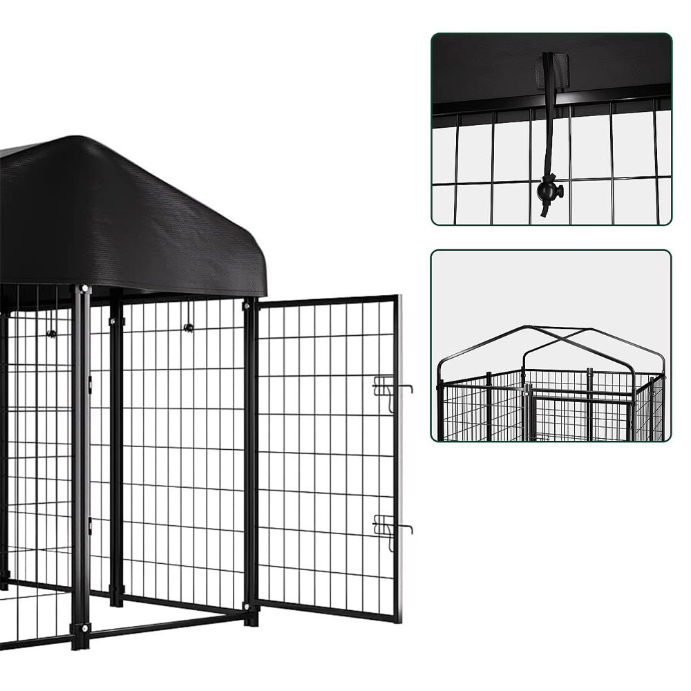 A masszív fém keret tartósan ellenáll az időjárás viszontagságainak, míg az UV-álló szövettető gondoskodik a megfelelő árnyékolásról és védelmet nyújt kedvencednek a napsugarak ellen. A könnyen tisztítható anyag biztosítja a higiénikus környezetet. A kennel egyszerűen összeszerelhető és stabil struktúrájának köszönhetően biztonságos kerti időtöltést tesz lehetővé kisállatod számára. Az ajtó megfelelően felszerelve be- és kifelé is nyílik.