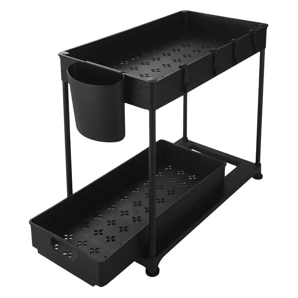 Ez a mosogató alá helyezhető két szintes rendszerező állvány praktikus megoldást kínál a konyha vagy fürdőszoba rendezettségéhez. A két szintes kialakítás és a kihúzható alsó tároló könnyű hozzáférést biztosít a tárolt eszközökhöz. Stílusos dizájnjával nemcsak funkcionális, hanem esztétikus kiegészítője is a helyiségnek.