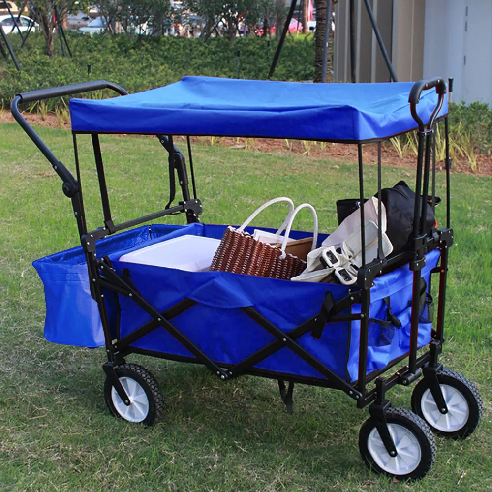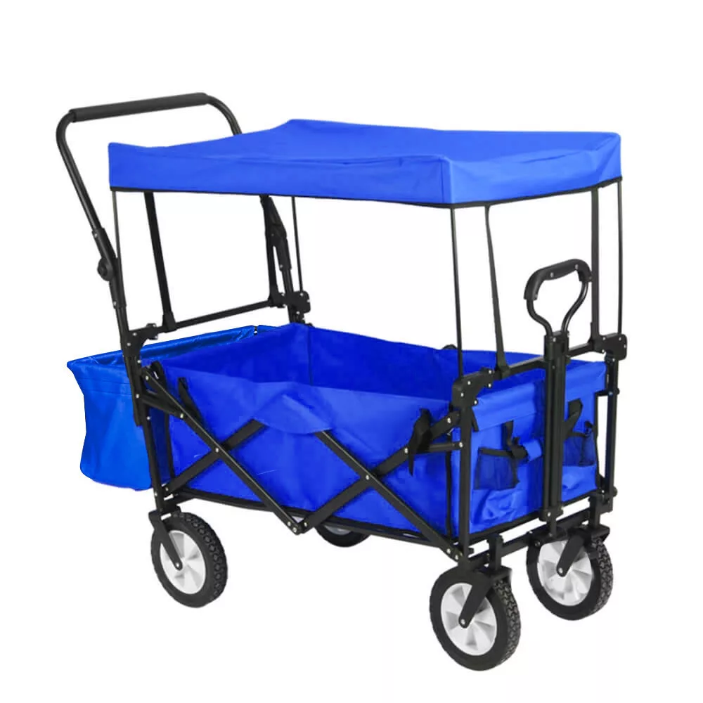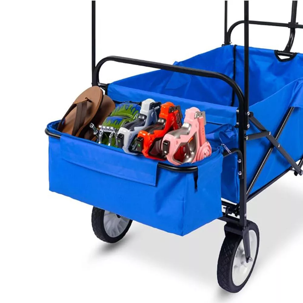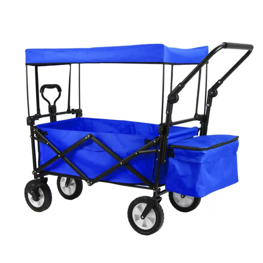 Az összecsukható, tetővel ellátott kézikocsi ideális társ kerti munkákhoz, kirándulásokhoz, strandoláshoz vagy akár horgászathoz. Erős, 100 kg teherbírású kialakításának és kényelmes hordozhatóságának köszönhetően szinte bármilyen feladatra alkalmas. Levehető tetője és tárolózsebei még praktikusabbá teszik, a masszív váz pedig egyszerűen összecsukható, így kis helyen is elfér.