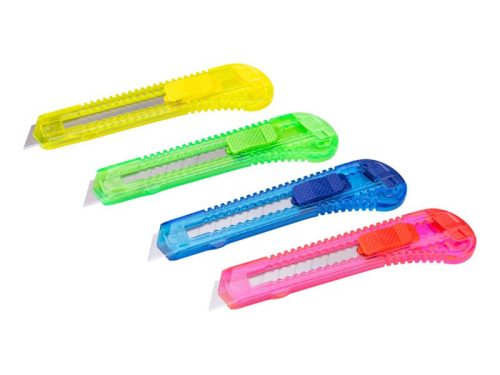 Műanyag bontókés készlet 18 mm, 12 db, műanyag kerek doboz, színkeverék.