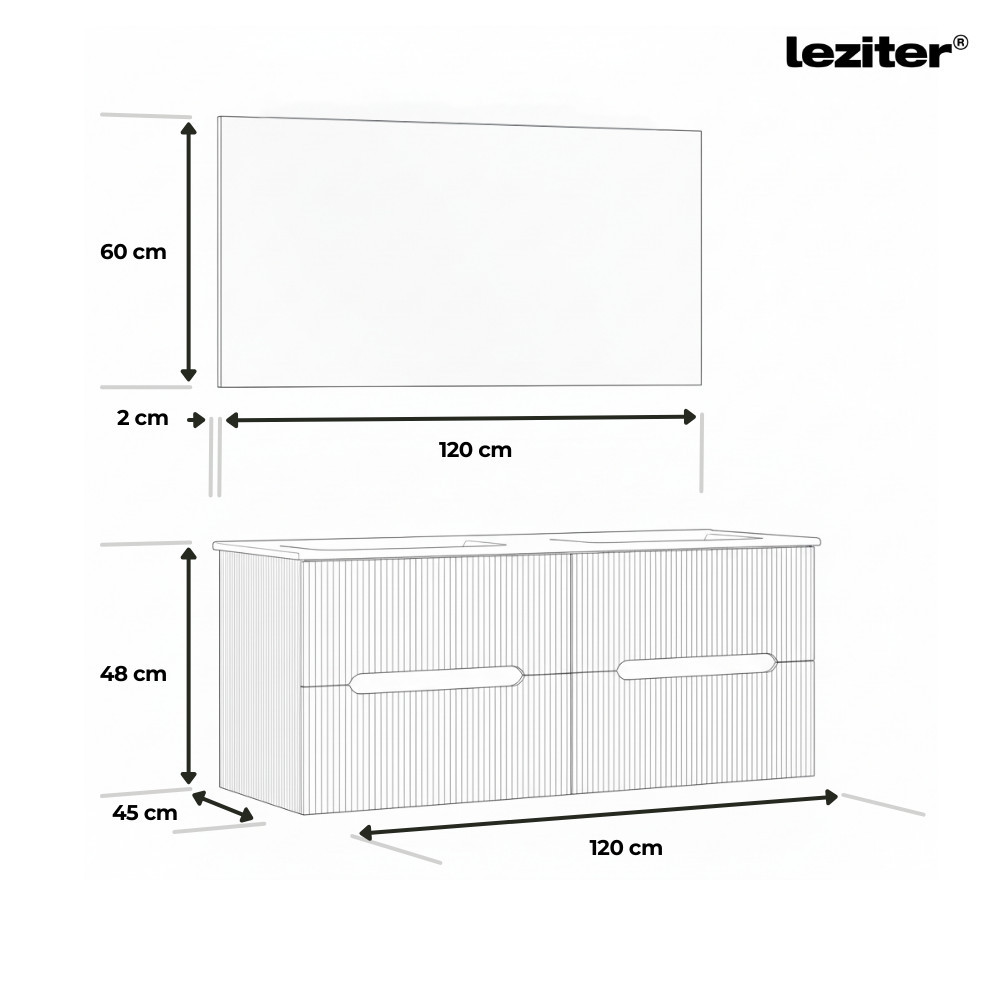 A Leziter Trent fürdőszobabútor harmonikusan ötvözi a látványt és a praktikumot. A bordázott előlap letisztult, modern karaktert ad, miközben az integrált fogantyú kényelmes használatot tesz lehetővé. A fali rögzítés könnyed megjelenést teremt, a padló takarítása pedig gyorsabbá válik. A kerámia mosdó tartós, időtálló, ellenáll a mindennapos igénybevételnek és egyszerűen tisztán tartható.
