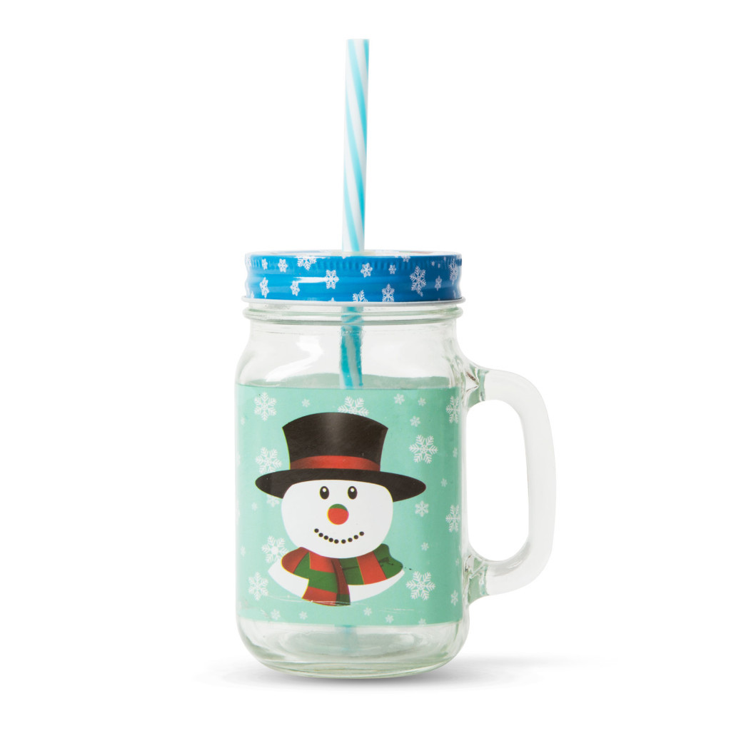Üveg korsók, vidám karácsonyi mintákkal: Mikulás, hóember, rénszarvas, különböző színekben, fém zárókupakkal.