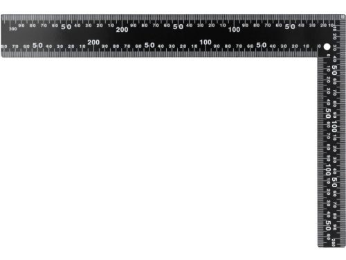 Fekete fém sarokszög 300x200 mmJobb szögek meghatározására használható építési és mérési munkák során.  vastag lemezből készült fekete színűre festett. az egyik oldalán könnyen olvasható milliméteres beosztás, a másik oldalán hüvelykes beosztás .