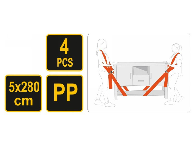 Szíjak, készült tartós polipropilén szövetből. Bútorok vagy más nehéz eszközök szállítására tervezték, például költözéskor. A szíjakat, a modelltől függően, a hátunkon/hám szerűen/ vagy az alkarunkon viseljük, nagyban megkönnyítik a nehéz, nagyméretű tárgyak áthelyezését, csökkentik a fáradságot, és növelik a munkabiztonságot, miközben megvédik a szállított bútort a sérülésektől. A széles modellválaszték lehetővé teszi, hogy a jelenlegi igényekhez legjobban illő szíjakat válasszuk. Méretek: 5 x 280 cm. A csomag 2 szíjat tartalmaz - acél tárolóval és acél csatokkal a hátunkon viselt, valamint 2 teherbíró szíjat. Három csatlakozási lehetőség /hossz/ /hossz/. Nehéz eszközök, például bútorok szállítására, költözéskor.