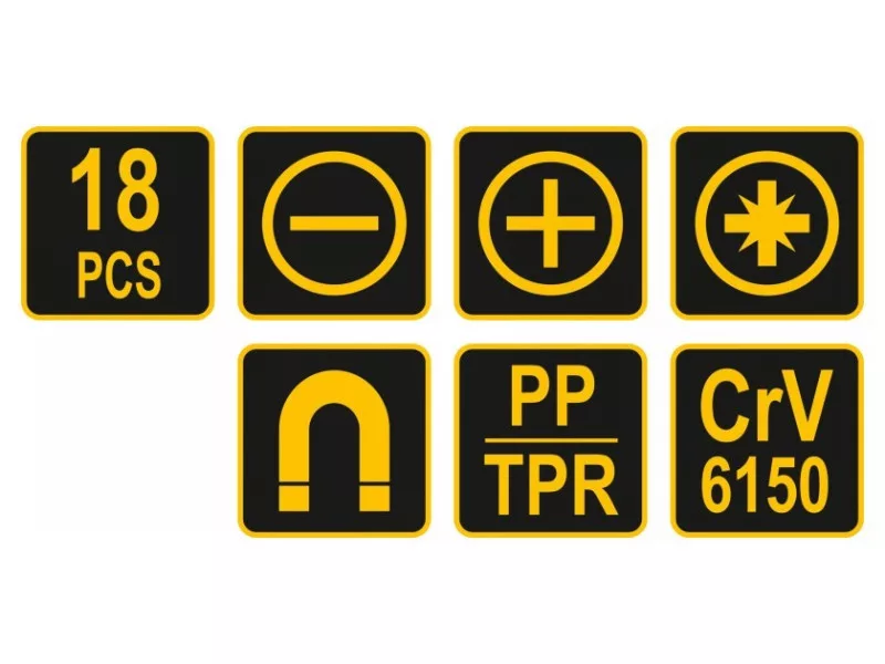 Minőségi anyagokból készült. Széles méretválaszték biztosítja a sokoldalú felhasználást és a nehezen elérhető helyek elérését.tartós CrV 6150 acélergonomikus, csúszásmentes PP és TPR műanyag nyélCsavarhúzók:lapos: 6.5 x 38, 5.5 x 75, 6.5 x 100, 8.0 x 150 mmPhillips: PH2 x 38, PH1 x 75, PH2 x 100, PH3 x 150 mmPontos csavarhúzók:Lapos: 2.5 x 50, 3.0 x 50 mmPhillips: PH00 x 50, PH0 x 50 mmTORX: T5 x 50, T6 x 50, T7 x 50, T8 x 50, T9 x 50, T10 x 50 mm Használati figyelmeztetések: Figyelem! Mindig használjon személyes védőfelszerelést munka közben.