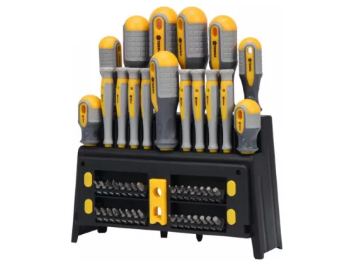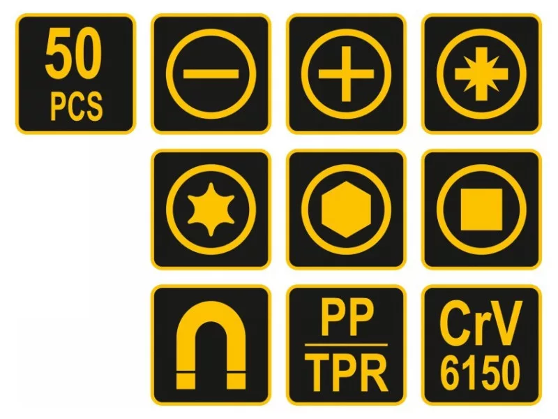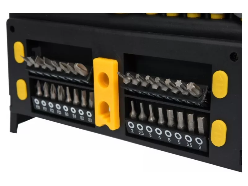 Magas minőségű anyagokból készült. A nagy méretválaszték biztosítja a sokoldalú használatot és a nehezen hozzáférhető helyek elérését.tartós CrV 6150 acélergonomikus, csúszásmentes PP és TPR műanyag nyelvekcsavarhúzók:laposfejű: 6.5 x 38, 4.0 x 75, 6.5 x 100, 8.0 x 150 mmPhillips: PH2 x 38, PH1 x 75, PH2 x 100, PH3 x 150 mm- hosszabbító 6.3 x 75 mm- precíziós csavarhúzók:laposfejű: 2.0 x 50, 2.5 x 50, 3.0 x 50 mmPhillips: PH00 x 50, PH0 x 50 mmTORX: T6 x 50, T8 x 50, T10 x 50 mm- bitfejek:lapos: 3, 4, 5, 6 mmPhillips: 0, 1, 2, 3 mmPozidriv: 0, 1, 2, 3 mmHEX: H2, H2.5, H3, H4, H5, H5.5, H6TORX: T8, T10, T15, T20, T25, T27, T30, T40Négyzet: S0, S1, S2, S3- mágneses és nem mágneses rész Használati figyelmeztetések: Figyelem! Mindig használjon személyes védőfelszerelést a munka során.