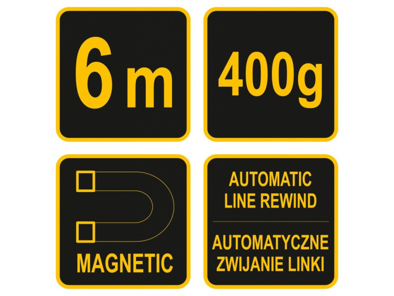 400 g-os kőműves léc, amely 6 m hosszú zsinórra van függesztve. A kazetta automatikusan feltekerő kábelmechanizmussal, erős mágnessel van felszerelve, amelyet a függőlegesek fém szerkezeti elemekhez való rögzítéséhez használnak, valamint éles velővel, amely megkönnyíti a rögzítést fára vagy más építőanyagokra. A testben van egy lyuk, amely lehetővé teszi a függőleges könnyű felakasztását a betonfalakra /szögek beverése után/. Az alkalmazott megoldások jelentősen rövidítik a lengő stabilizálásának idejét. Használati figyelmeztetések: Ha nem használja, zárja le a csapot, hogy elkerülje a sérülést.