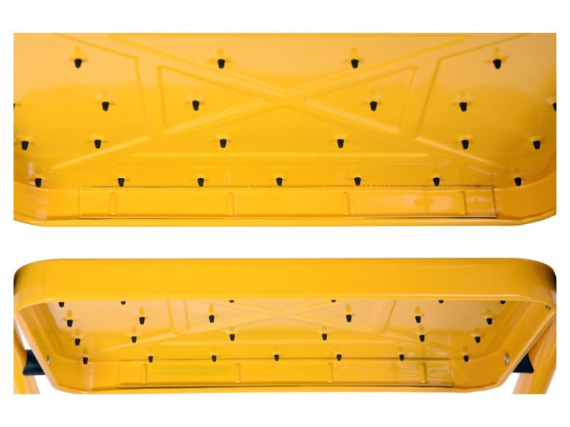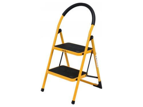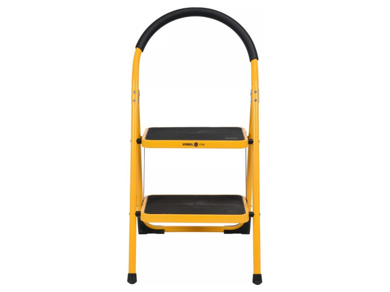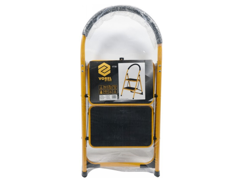 Egy kétlépcsős létra 17730 VOREL márkától.A létrának két lépcsőfoka van, melyek mérete 36x26cm, és továbbá csúszásgátló betéttel vannak ellátva. Ez lehetővé teszi, hogy biztosan és stabilan álljon rajta anélkül, hogy attól tartana, megcsúszik vagy megbotlik. Egy további védőkeret a létra tetején, puha szivacs bélés biztosítja a védelmet az eséstől, és egyben nagyon kényelmes a szállítás során.A lábakon különösen profilált talpak találhatóak, amelyek nagymértékben növelik a létra stabilitását és megakadályozzák az elcsúszását a talajon.A beépített zárszerkezet megakadályozza, hogy a létra használat közben összecsukódjon, tovább növelve a munkabiztonságot.Minden lépcsőfok alatt további megerősítés van a szilárdság növelése érdekében. Ennek eredményeként a létranak akár 150kg teherbírása is lehet, és különösen hasznos:alacsony raktárakbanüzletekbenszolgáltató pontokonműhelyekbenháztartásokbankisebb javítási munkáknál.Lehetővé teszi, hogy könnyen, kényelmesen és biztonságosan magasabb termékeket szedjen le. Takarításnál vagy kisebb felújításoknál is nagyon hasznos.A létra kinyitva 90x47.5x49cm méretű, ésösszecsukva csak 99cm magas. Ennek eredményeként nem foglal sok helyet tárolás vagy szállítás során.A lépcsőfokok magassága:24cm50cmA padlótól mérve a kinyújtott létrán.