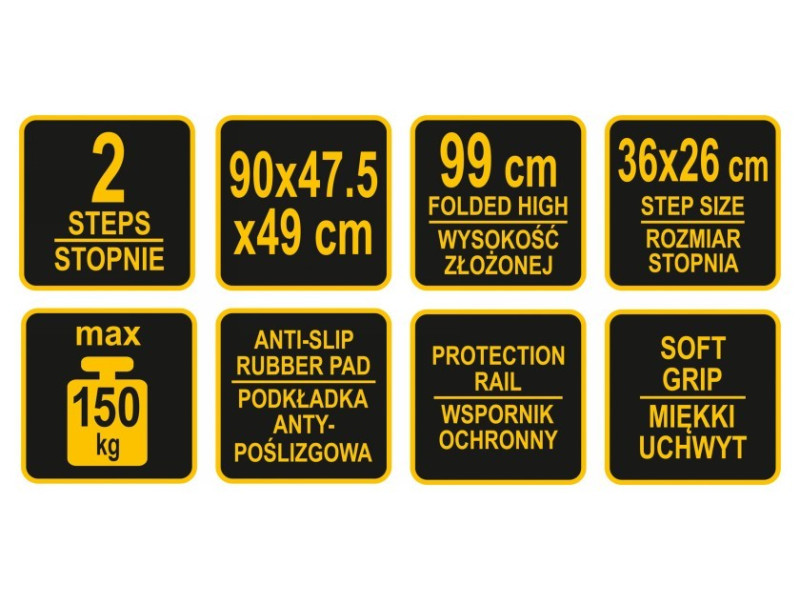 A létrának két lépcsőfoka van, melyek mérete 36x26cm, és továbbá csúszásgátló betéttel vannak ellátva. Ez lehetővé teszi, hogy biztosan és stabilan álljon rajta anélkül, hogy attól tartana, megcsúszik vagy megbotlik. Egy további védőkeret a létra tetején, puha szivacs bélés biztosítja a védelmet az eséstől, és egyben nagyon kényelmes a szállítás során.