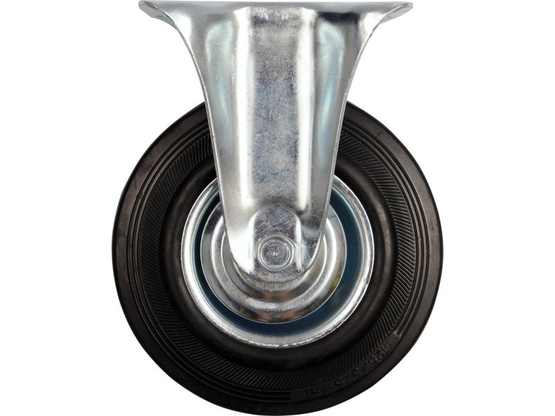 Rögzített szerelvényű kerék, 100 mm átmérőjű, csapágyas, fekete gumiabroncs, 130 mm magas.
