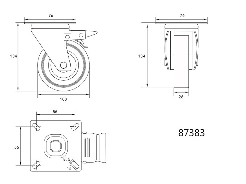 Forgó kerék, 100 mm átmérőjű, csapágyazott, fékkel és rögzítőlappal, a futófelület szürke gumi. Forgó kerék, 100 mm átmérőjű, csapágyazott, fékkel és rögzítőlappal, a futófelület szürke gumi.