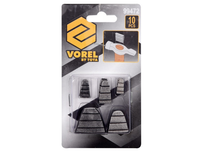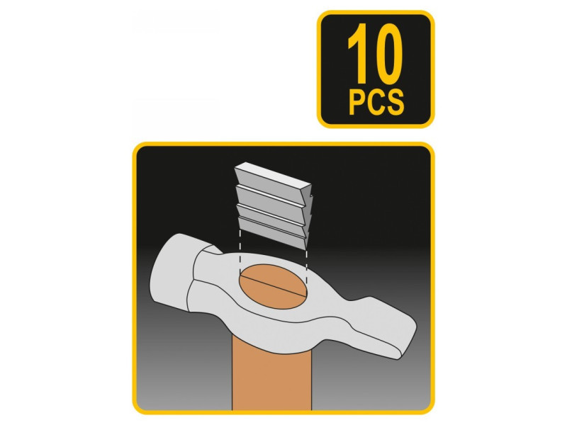 Cél - biztosítani a kapcsolatot a fa nyéllel.Anyag acél, lépcsőzetes vágással.Egy készletben öt méret található: kettő no.1/28 x 32 mm/, 2/ 25 x 21/, 3/ 25 x 12 mm/,4/ 18 x 10 mm/, 5/17 x 8 mm/.A különböző méretek lehetővé teszik, hogy optimálisan illessze a ékeket az általad használt szerszámmal. Használati figyelmeztetések: A kéziszerszámok használata veszélyes lehet! Mindig használjon személyes védőfelszerelést munka közben. Csak megfelelő, sértetlen szerszámokat használjon. Válassza ki a szerszám típusát és méretét a tervezett felhasználás szerint. Ne terhelje túl a szerszámokat. Tartsa a szerszámokat távol a gyermekektől. Gondosan használja a szerszámokat.