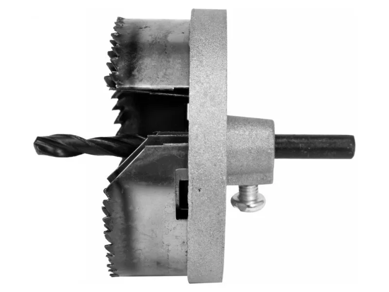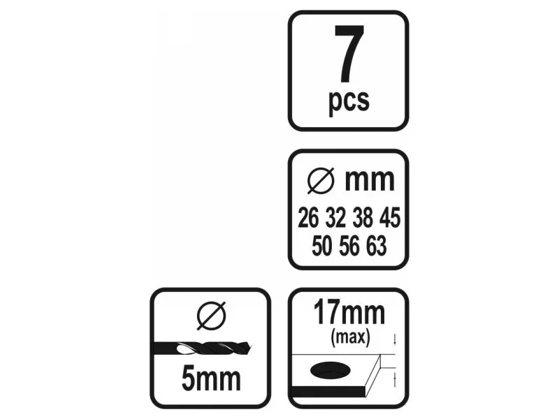 Hétszeres lyukfűrész készlet, mely elektromos fúróval hajtható, a fogantyún rögzített. Átmérő tartomány 26 mm-től 63 mm-ig. A középpontot a központosító fúró határozza meg. Edzett fogak.
