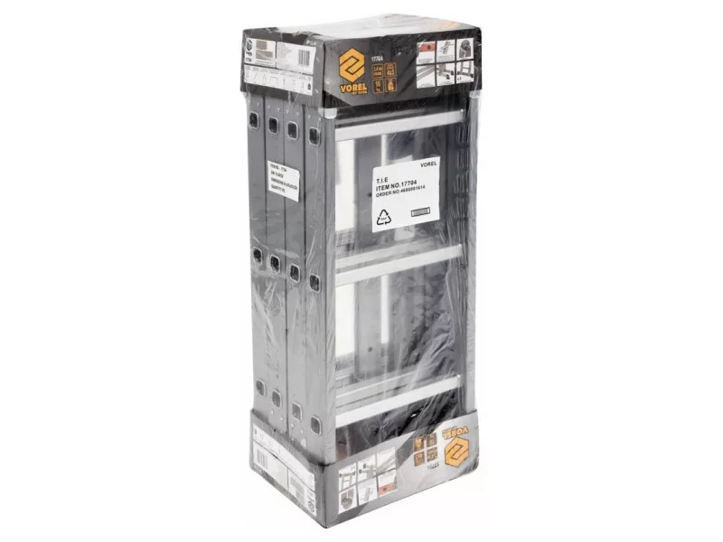 4x3 multifunkciós létra maximum 3,4 m magassággal. Megfelel a PN EN131 európai szabványnak 150 kg teherbírással lépcsőnként. Négy szegmensből áll, amelyek erős és tartós csuklókkal vannak összekötve. Minden csukló rendelkezik csavarzárral, amely lehetővé teszi a létra beállításainak gyors és kényelmes megváltoztatását az igényeknek megfelelően. Ez lehetővé teszi a létra sokféle pozícióba való beállítását, beleértve: festés: szabadon álló A típus - 1.66 m eresz alatt: lehetővé teszi például az eresz alatti beállítást a csatorna javítása vagy tisztítása, vagy a tetőfedési munkák során - 2.5 m szabadon álló: egyenes - 3.4 m összecsukva: méretei 93.5 x 34.5 x 27cm padló/platform: platformokkal való használatra (külön eladva) - 0. 9 x 1.4 m keleti: lehetővé teszi a lépcsők közötti távolság beállítását A létrák megerősített acélprofilokból készülnek, amelyek vastagsága 1,0 mm, és sokkal erősebbek, mint az alumínium. Ennek eredménye a stabilitás és a biztonság jelentős növelése, valamint a létra élettartamának meghosszabbítása. Az alumínium lépcsőfokok 1,2 mm vastag profilokból készülnek, amelyek mindkét oldalonprofilált csúszásgátló felületekkel rendelkeznek. A létra két széles stabilizátorral van befejezve, ami jelentősen növeli a stabilitást és a biztonságot a használat során. Minden stabilizátor két kontúrozott csúszásgátló talppal rendelkezik, amelyek növelik a talajjal való tapadást a létra bármely kinyitási pozíciójában. A létra összecsukva 93.5 x 34.5 x 27 cm. Ez számos előnyt biztosít: szállíthatóság - még egy személyautó csomagtartójába is befér. Ez megszünteti a tetőcsomagtartón vagy furgonban való tojásszállítás szükségességét. Csökkenti a lopás kockázatát hordozhatóság - könnyű és kényelmes hordozás, különösen lépcsőházakban. Megelőzi a falak karcolódásának vagy sérülésének kockázatát tárolhatóság - kis méretű használati helyiségekben, raktárakban, erkélyen, pincében, garázsban vagy akár szekrényekben is tárolható Előnyök a több pozícióba való kinyitás lehetősége sokoldalú felhasználást tesz lehetővé a megerősített acélkonstrukció növeli a létra tartósságát az összecsukott méretek megkönnyítik a szállítást, hordozást és tárolást a széles stabilizátorok kiküszöbölik a felborulás veszélyét a profilált csúszásgátló talpak növelik a talajjal való tapadást lehetőség további Vorel 17705 platform felszerelésére . Használati figyelmeztetések: Ne álljon a létra felső két fokára platform és kéz/térdvédő sín nélkül. Ne álljon a létra felső három lépcsőfokára!