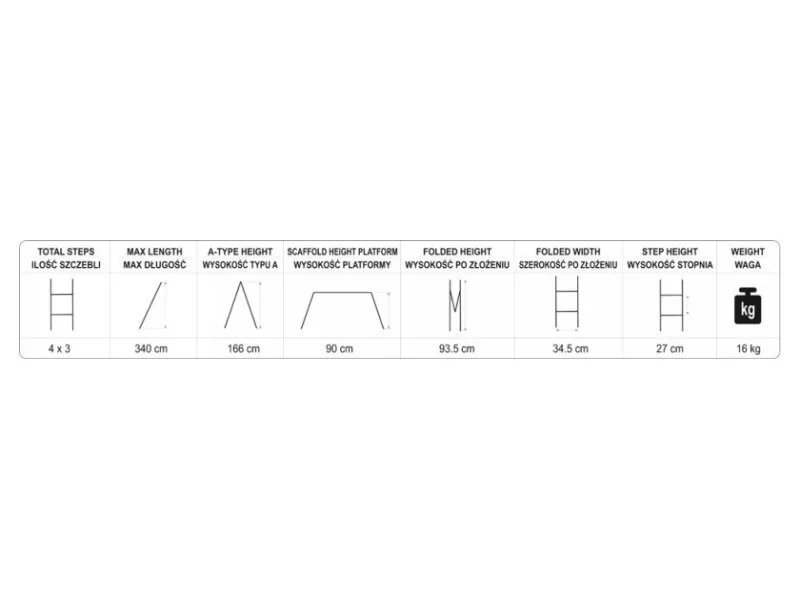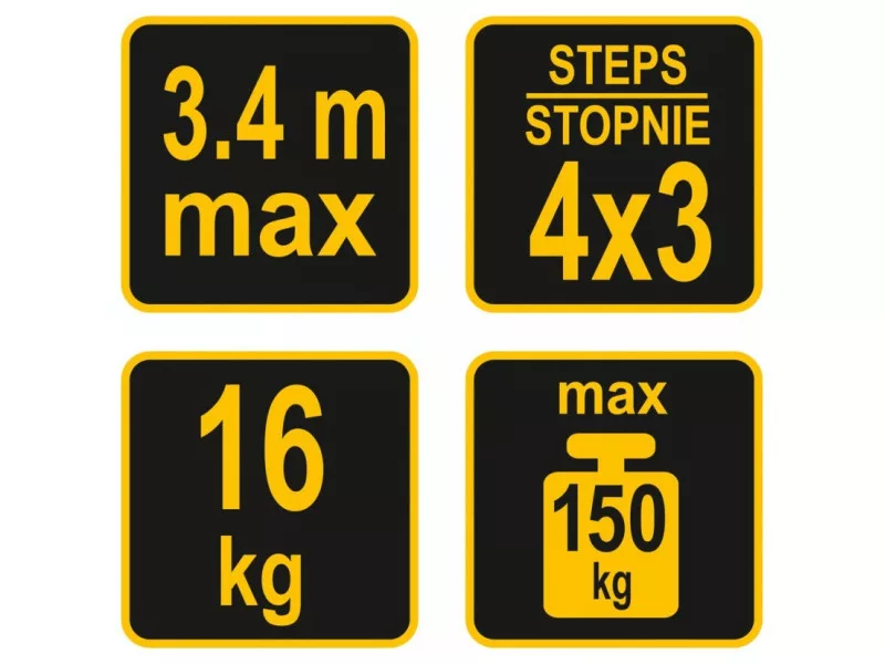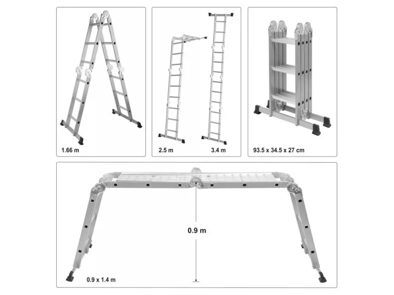 4x3 multifunkciós létra maximum 3,4 m magassággal. Megfelel a PN EN131 európai szabványnak 150 kg teherbírással lépcsőnként. Négy szegmensből áll, amelyek erős és tartós csuklókkal vannak összekötve.