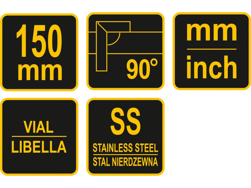 Fém szöglet 150 mm alumínium profilból készült lábbal, beépített vízmértékkel. Derékszög meghatározására. A hosszabb kar szélessége: 30 mm vastagság: 0.5 mm a láb hossza: 110 mm milliméteres és hüvelykes beosztás állandóan alkalmazva a kar mindkét oldalán Használati figyelmeztetések: Figyelem! Mindig használjon személyes védőfelszerelést munka közben.