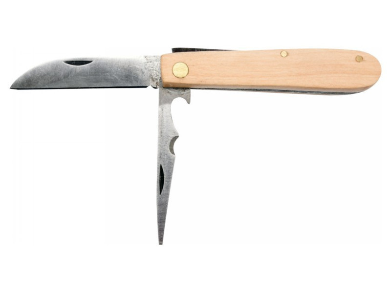 Összecsukható szerelőkés két pengével. felszerelve sörnyitóval és különleges bevágással a szigetelés lehúzásához a fa nyél borítások nagy tartósságot és esztétikailag kellemes, klasszikus megjelenést biztosítanak a kés elengedhetetlen minden szerelési és műhelymunkában, valamint más háztartási alkalmazásokban Műszaki adatok: EAN: 5906083766503 egység: db
