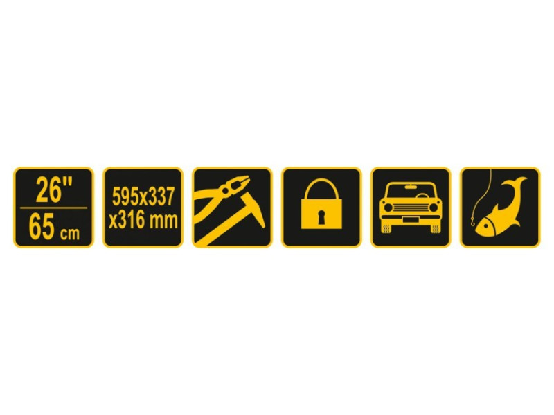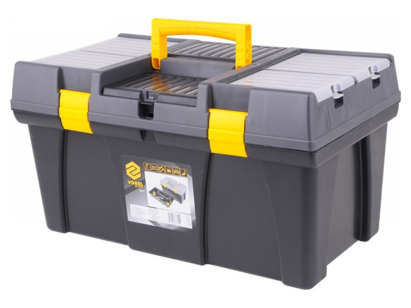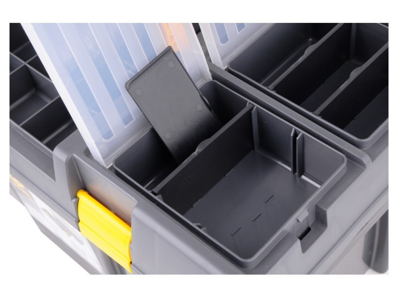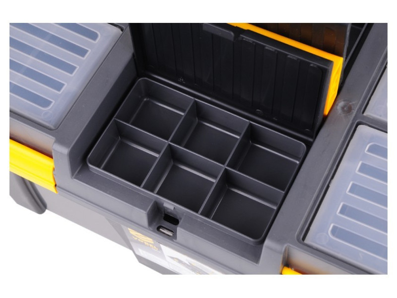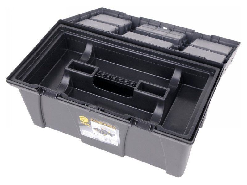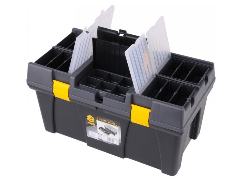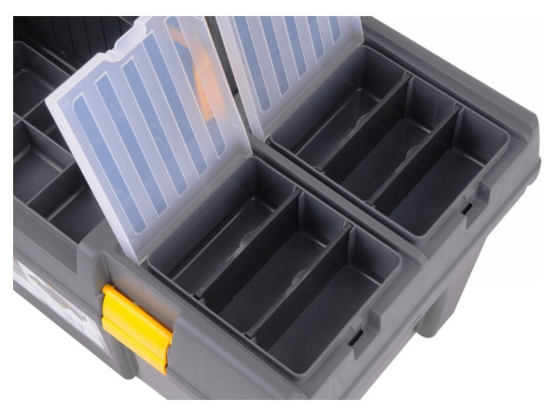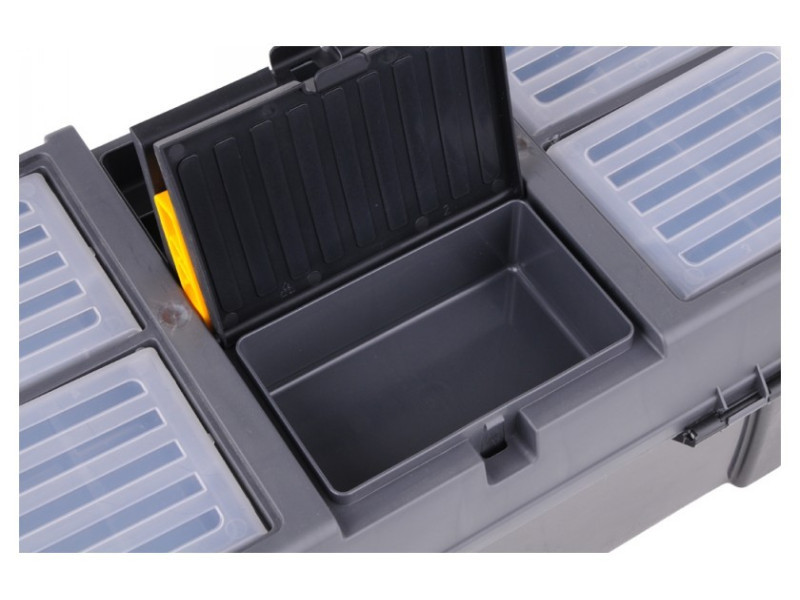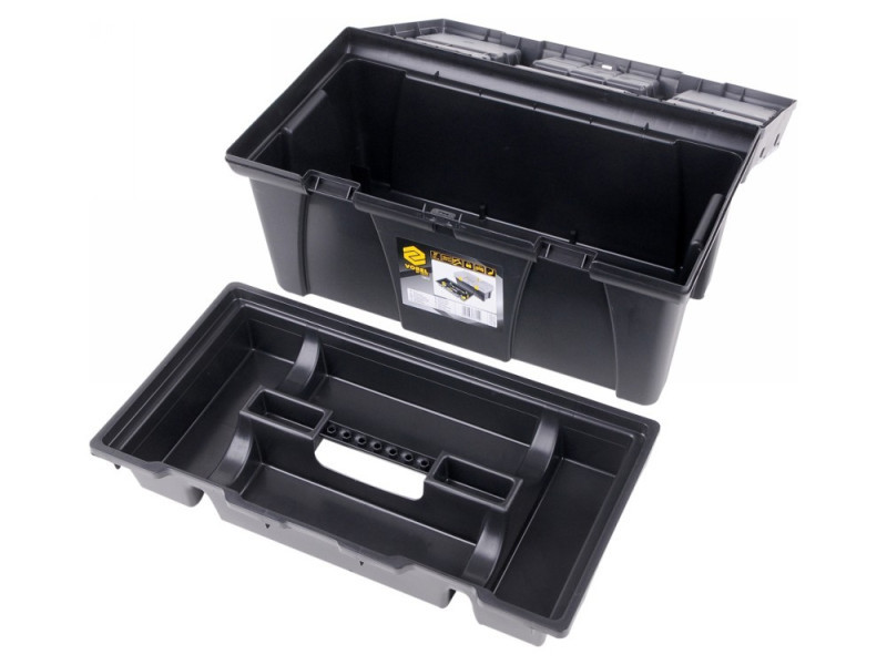 26"-os szerszámosláda kihúzható tálccal, bitek tárolására szolgáló tartóval és további szervezőkkel kisebb tárgyak tárolásához.Műanyagból készült. Egy masszív csatt megakadályozza a nem kívánt nyitást kezelés közben. A doboznak speciálisan kialakított oldalfogantyúi vannak a könnyű szállítás érdekében. Különböző típusú tárgyak - például szerszámok, horgászfelszerelések - stb. kényelmes szállítására használják.