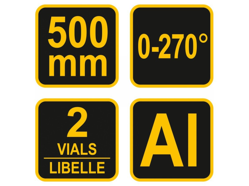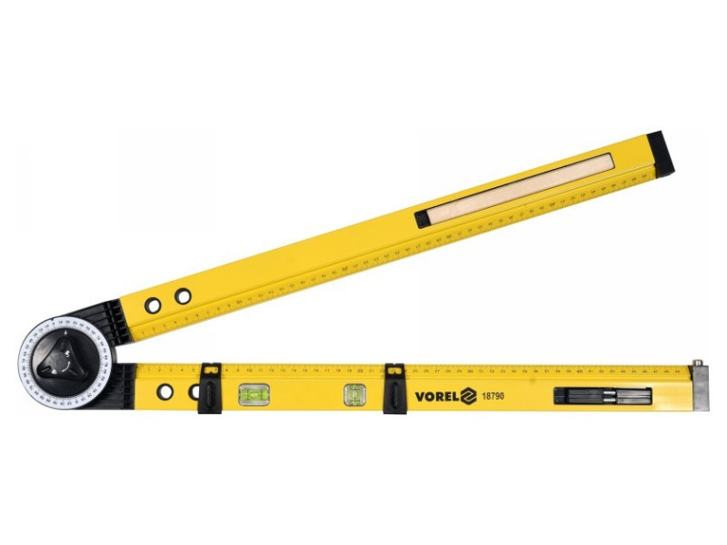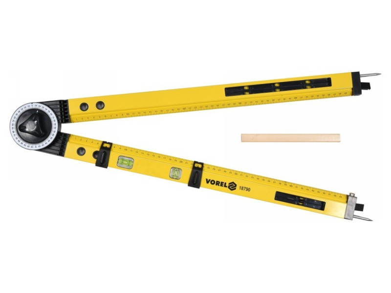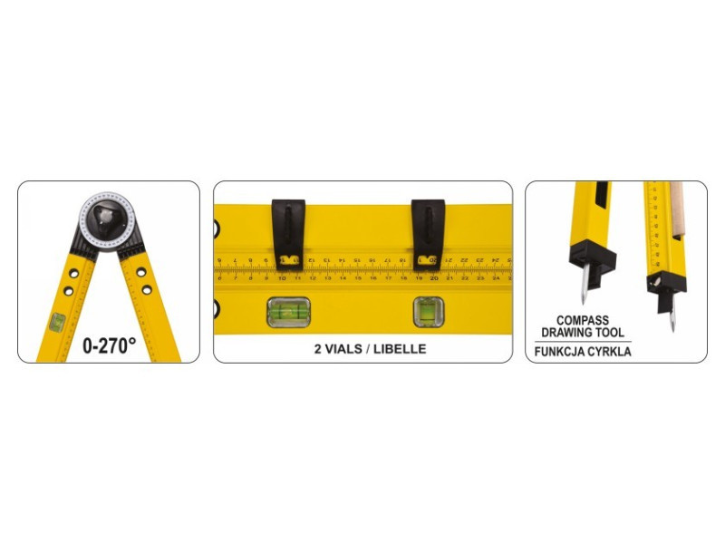 Építőipari szögletmérő, hossza körülbelül 630 mm, szögek mérésére vagy körök meghatározására  karok alumínium profilból készültek műanyagból készült fej skálával Beépített két vízmérték a karok belső szélén 1-500 mm-es milliméteres skála   További jellemzők: 2 csúszka pozicionáláshoz asztalos kaparó két tű körkörös funkcióhoz .