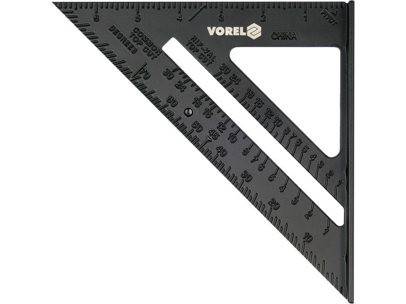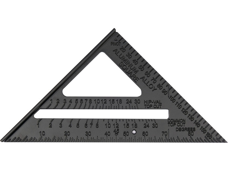 250 mm-es alumínium szöglet lábbal  alumínium szöglet lábbal - excentrikus méretek 180 x 180 x 250 mm, vastagság kb. 2,5 mm a széleken állandóan jelzett milliméteres és hüvelykes osztások a szöglet felülete festett   Méréshez és jelöléshez tetőfedésnél, asztalosmunkánál, ácsmunkánál.