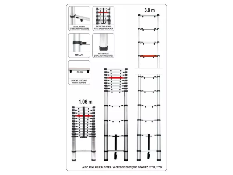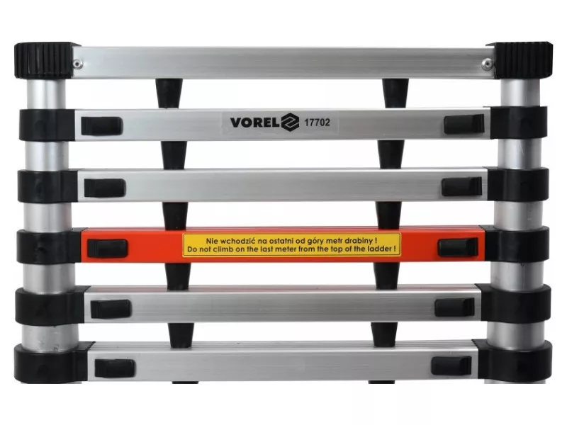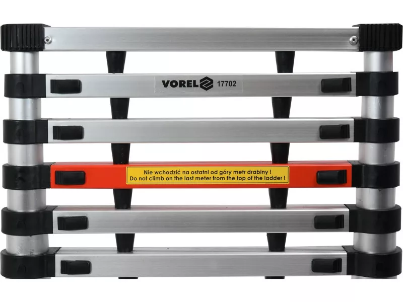 Alumínium sz telescópos létra, amely hasznos a magasságban végzett munkákhoz otthon, kertben, raktárban, műhelyben és építkezésen. • tartós alumíniumból készült, ellenáll a mechanikai sérüléseknek • a nylon létrafokok ellenállnak az időjárási tényezők hatásának • a csúszásgátló lépcsőfokok csökkentik az esés veszélyét • a figyelmeztető létrafok jelzi a maximális biztonságos munkamagasságot • a körvonalazott gumi csúszásgátló talpak jó tapadást biztosítanak a talajon • összecsukva kis méretű, így könnyen szállítható és tárolható • a EN 131-6:2015 irányelvnek megfelelően készült A VOREL teleszkópos alumínium létrának széles körű alkalmazási lehetőségei vannak: - otthon - a kertben - építkezéseken - kiskertekben Használati figyelmeztetések: Ne mászjon fel a létra tetejétől számított utolsó méterre! Mindig teljesen húzza ki alulról! Győződjön meg arról, hogy minden lépcsőfok be van zárva, nincs lehetőség a kinyitásra. Mozgassa mindkét zárat egyszerre és engedje, hogy a létra automatikusan kinyíljon.
