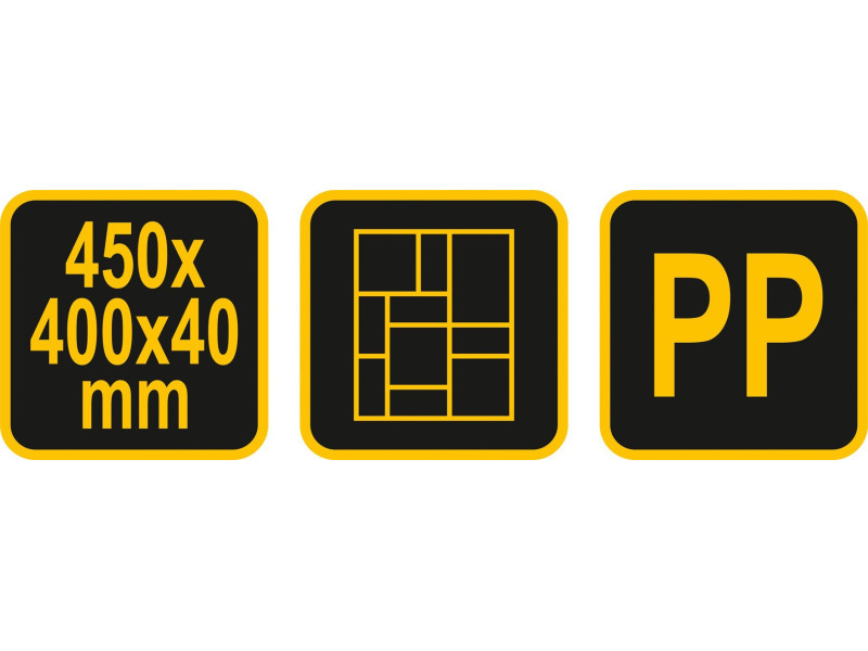 Egy öntött, friss betonba készíthető járólap vagy kőmintát utánzó burkolatmintázó forma. A forma kemény polipropilén (PP) műanyagból készült, ami többszöri használatra teszi alkalmas.Méretek kb. 400 x 440 mmForma magassága: 40 mmA legkedvezőbb hatás elérése érdekében ajánlatos több formát használni, egyszerre lenyomatot készítve, például négy szegmensből. A burkolat készítéséhez, kerti ösvények, teraszok, lépcsők, padlók és más frissen öntött beton darabok díszítésére. Előállítjuk a járólapok vagy rakott kövek kezdeti vázlatát. Az elérhető hatást növelni tudjuk a minta fugázásával vagy speciális betonfestékekkel való színezésével. Az előkészített beton aljzatba helyezzük / érzékenyen nyomva / a kiválasztott formát úgy, hogy azt a beton megkötése után ki lehessen húzni. A forma eltávolítása után a kész aljzaton mélyedéses mintát kapunk, amely megfelel a kiválasztott formának. A munka befejezése után mossa le a formát, eltávolítva róla az esetleges maradék anyagot.