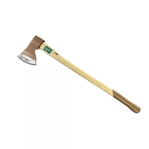 Körcsapolással rögzített, edzett acél fejű balta, formázott, lakkozott fa nyéllel.