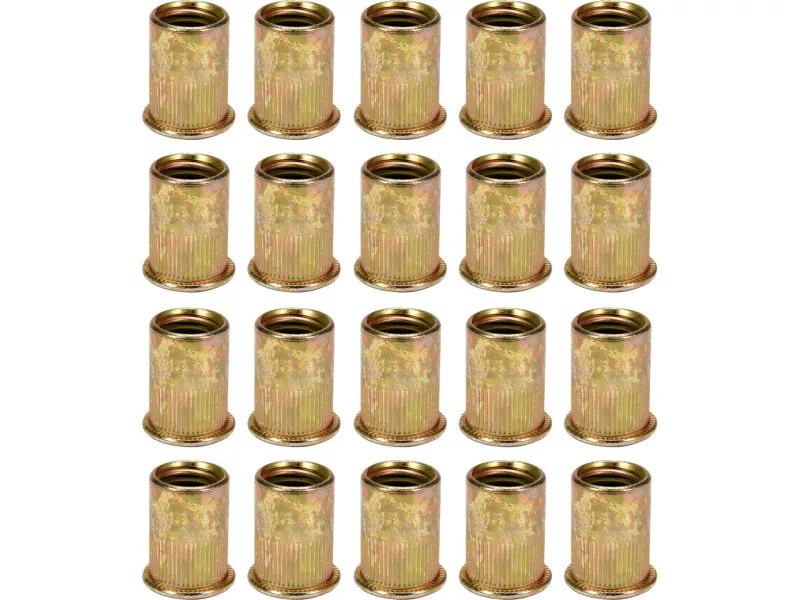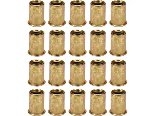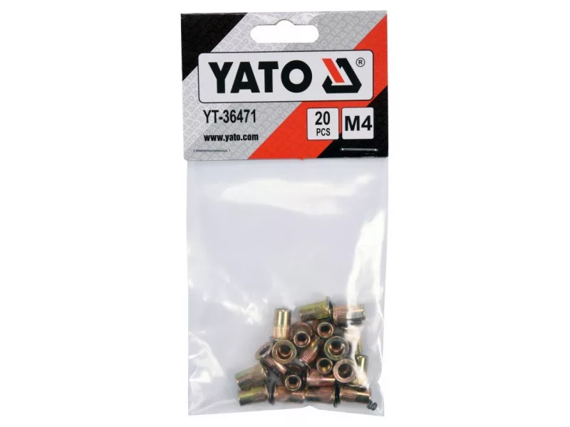 YATO márkájú M4 acél szegecsmutterek  Anyag: szénacél Méret: M4 Hossz: 11 mm Darabszám készletenként: 20 Cilindrikus bordázott flang, ami szorosabban tapad a rögzített alkatrészhez. A szegecsmutterek lehetővé teszik, hogy csavart vagy metrikus menetű csavart fúrjon lemezekbe vagy más anyagokba, ahol a menetképzés nem lehetséges.