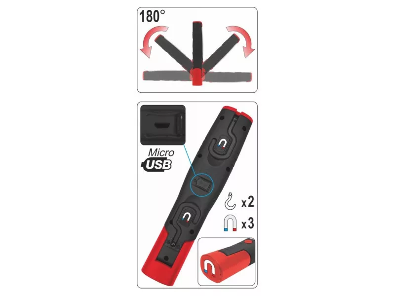 A forgatható ház lehetővé teszi a lámpa bármilyen szögben történő döntését. Ennek és a két horognak és a három mágnesnek köszönhetően könnyen és rugalmasan rögzíthető. Ez lehetővé teszi a kívánt tér optimális megvilágítását, miközben a kezei szabadok maradnak.
