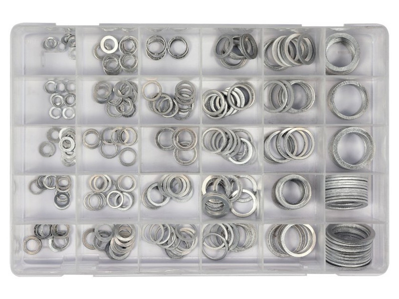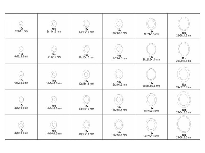 Egy 300 darabos alumínium olajdugó kitömő padok szett. A készlet 5x9x1.0 mm-től 28x36x2.0 mm-ig tartalmaz méreteket. Az egész egy kényelmes "válogató" csomagolásban található.