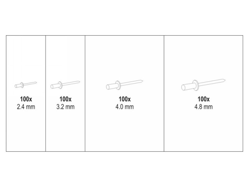 Szakadó szegecs 400 db. vegyes méretek   Szakadó szegecs acél szárral a négy legnépszerűbb méret 2,4 mm-től 4,8 mm-ig kényelmes "válogató"