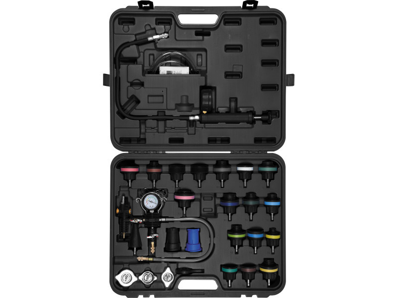 28 darabos szett radiátor szivárgások tesztelésére és gyors hűtőfolyadék cserére. Színekkel kódolt kupakok segítik a megfelelő tesztkupak kiválasztását. A teszter autószervizekhez, diagnostikai állomásokhoz stb. lett tervezve.