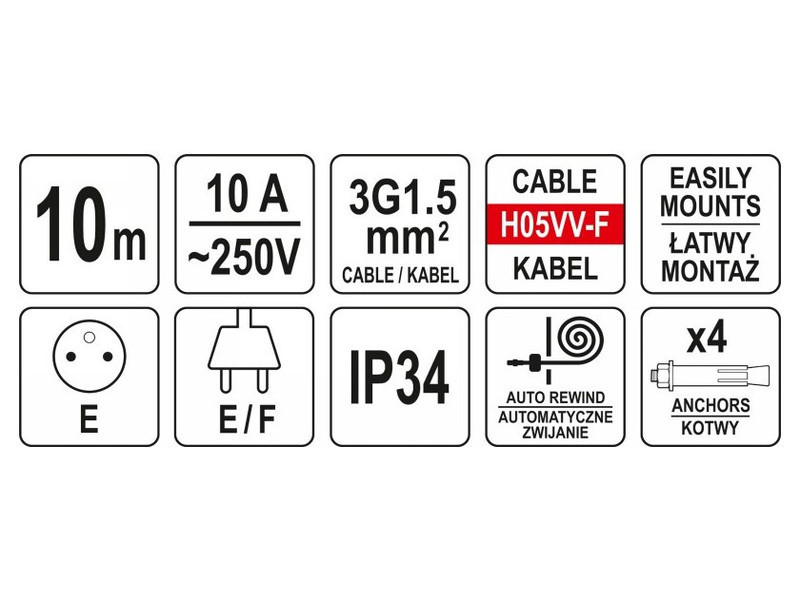 Elektromos hosszabbító automatikus dob segítségével. Minden műhely és gyártóüzem hasznos eszköze. Rugalmas, ellenáll a magas és alacsony hőmérsékletnek, a nyúlásnak és az agresszív vegyszerek hatásainak PVC bevonatú rézhuzalok elérhető automatikus visszahúzással ellátott házban, amely kiváló védelmet és kényelmes használatot biztosít egyszerű felszerelés munkapultra vagy falra a mellékelt 4 rögzítő tipli segítségével 16 A túlterhelés elleni kapcsoló kábelhossz: 10 m 1 m hosszú csatlakozó kábel A hosszabbító hőbiztosítékkal van felszerelve. A biztosíték gombja a ház középső részén található. A kábelt úgy lehet visszahúzni, hogy kissé kihúzzuk a házból, majd elengedjük. A hosszabbító kábelvisszahúzó zárral rendelkezik. A zár gombját a zárt lakat szimbólum irányába mozgatva aktiválható a zár, míg az nyitott lakat irányába mozgatva feloldható. Paraméterek: névleges feszültség [V~]: 250 névleges frekvencia [Hz]: 50 maximális terhelés (kábel teljesen feltekerve) [W]: 2500 maximális terhelés (kábel teljesen kihúzva) [W]: 2500 kábelhossz [m]: 10 kábel típusa: H05VV-F 3G1,5 mm2 csatlakozóaljzatok száma és típusa: 1x 2P+F/E védettségi fokozat: IP34 súly [kg]: 4,0