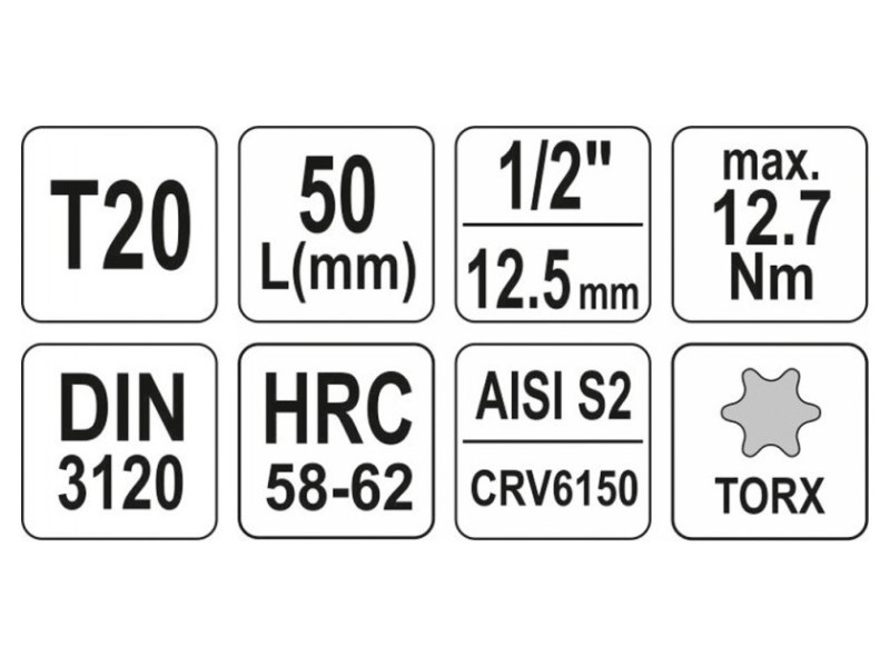Professzionális Torx hajtókulcs, 1/2"-os csatlakozással, t20 méret. Króm formájú kupak, CRV6150 acélból készült, AISI S2 acél mandrinnal, nikkel réteggel bevont. Nélkülözhetetlen eszköz autószerelő műhelyben vagy mechanikai műhelyben.