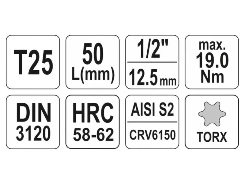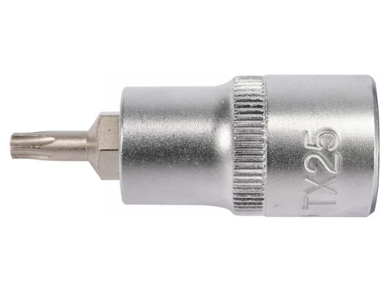 Professzionális Torx vakolókanál kulcs, 1/2 "csatlakozó, T25 méret. CRV6150 acélból készült króm kupak, Aisi S2 acél nyél és nikkel bevonattal. Nélkülözhetetlen eszköz egy autó vagy mechanikai műhelyben.
