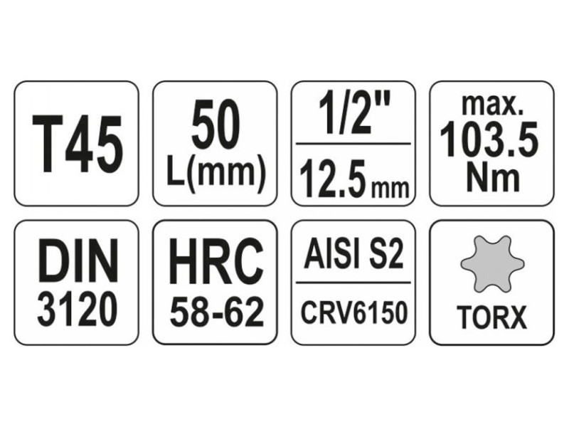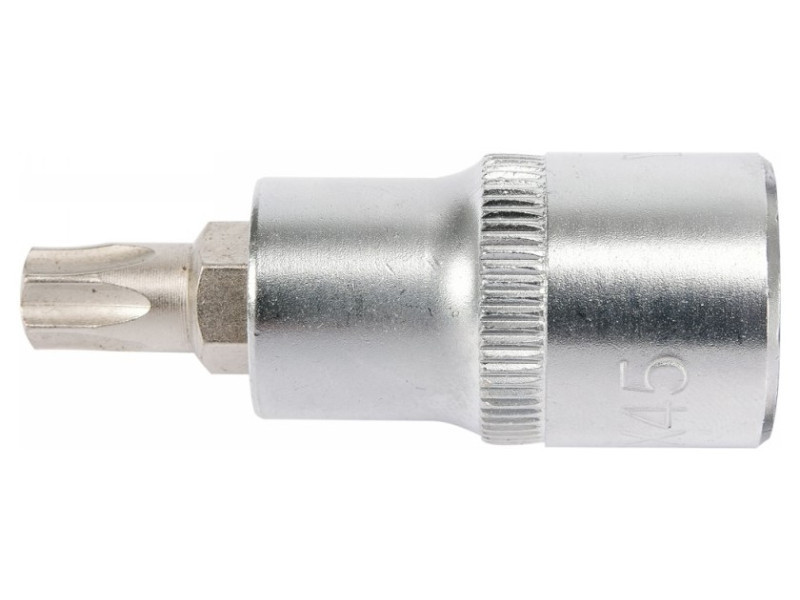 Professzionális Torx csavarhúzó, 1/2" csatlakozással, T45 méretben. Króm kupak, CRV6150 acélból készült, aisi S2 acél szárral és nikkel bevonattal. Pótolhatatlan eszköz egy autós vagy mechanikai műhelyben.