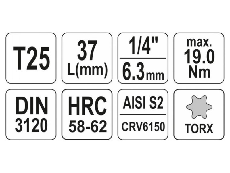 Professzionális Torx hajtók, 1/4 "csatlakozási méret, T25-es méret. Krómozott kupak, CRV6150 acélból készült, AISI S2 acél szárral és nikkel réteggel bevont. Pótolhatatlan eszköz egy autószerelő vagy gépész műhelyben.