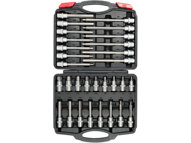 30 darabos HEX imbuszkulcs készlet csavarok lazítására kialakítva. Autószervizekben, építkezésekben, gyártásban és mezőgazdasági gépekben használatos. Anyag: S2 és CrV Szatén króm felület Méretek: 55 mm hosszúság: 5, 6, 7, 8, 10, 12, 14, 17, 19 mm 100 mm hosszúság: 5, 6, 7, 8, 10, 11, 12, 13 mm 140 mm hosszúság: 5, 6, 7, 8, 10, 12, 14 mm 200 mm hosszúság: 5, 6, 7, 8, 10, 12 mm Szerszám nyél: 1/2" (12.7 mm) Praktikus hordozható tokban szállítva Használati figyelmeztetések: Vigyázat! Mindig használjon személyes védőfelszerelést a munka során.
