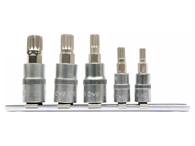 Professzionális spline kulcskészlet fém sínre. A króm csúszkák CRV6150 acélból készülnek, az acél pedig AISI S2 acélból készül és nikkel réteggel van bevont. A készlet 5 elemet tartalmaz. Pótolhatatlan eszköz autó- és gépszerelő műhelyben.
