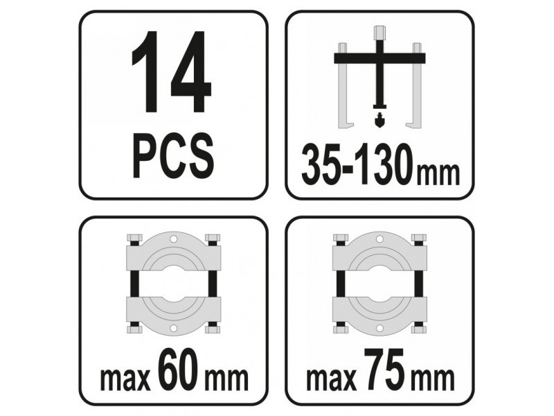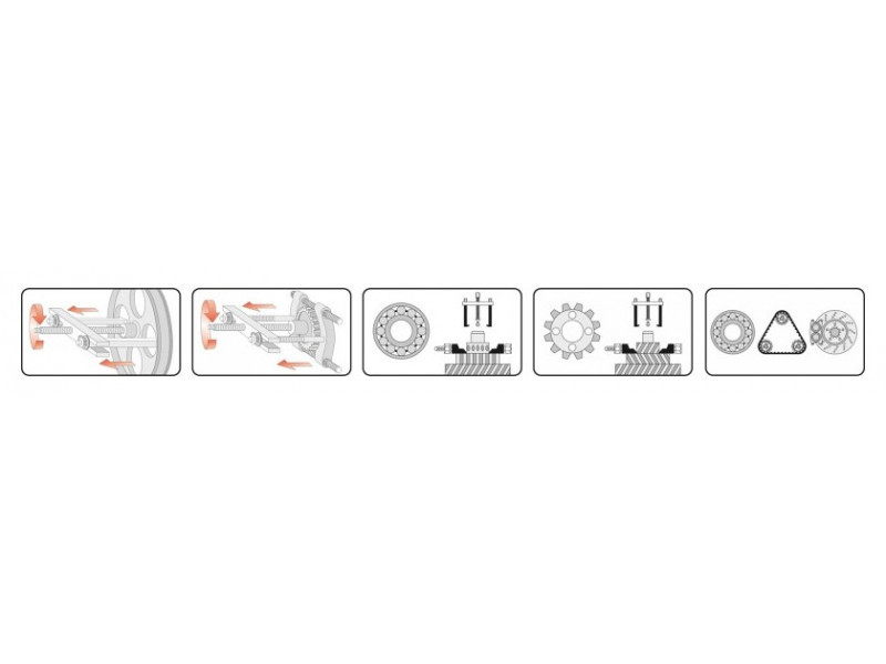 Két karos kihúzó csapágyak, fogaskerékfejek, féktárcsák stb. eltávolításához. Szeparátorokkal rendelkezik a szorosan illeszkedő alkatrészek könnyebb eltávolításához, és középső csavarokat is tartalmaz. Autószerelőknek és gépészeti szolgáltatásokhoz ajánlott.Állítható karok közötti távolság: 35 - 130 mmszeparátorok: 60, 75 mmkényelmes hordozótáskában csomagolva