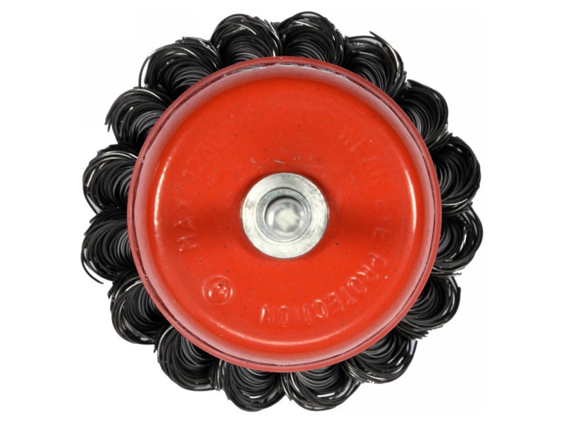 Forgácsolókefe, melyet fémfelületek tisztítására és polírozására, festékbevonatok, valamint rozsda eltávolítására és szerszámtisztításra terveztek, csiszológép használatával.