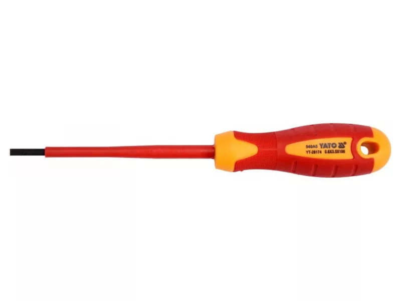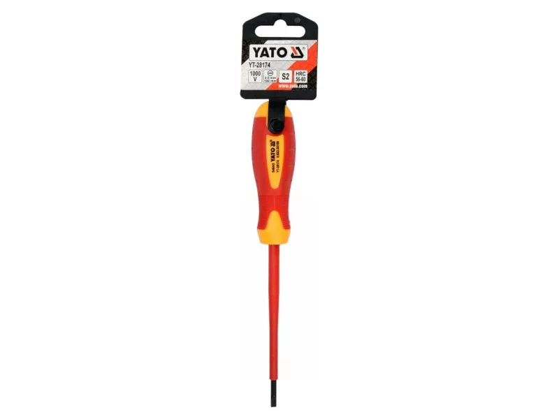 Laposfejű csavarhúzó YT-28174 VDE szigeteléssel, tartós S2 acélból készült, HRC 56-60-as keménységgel.