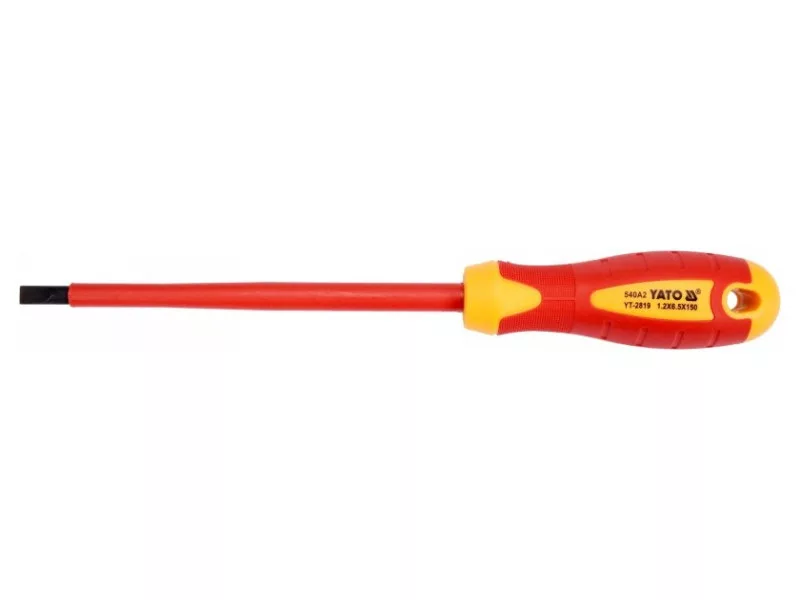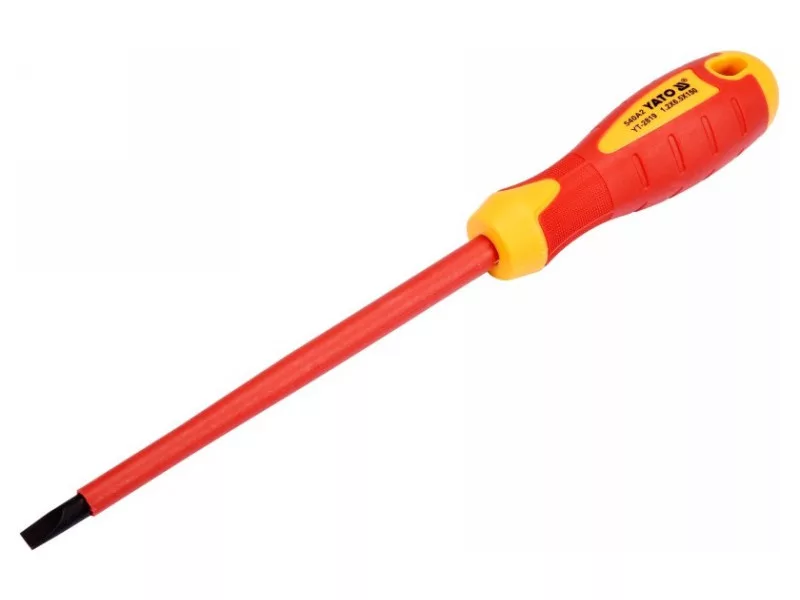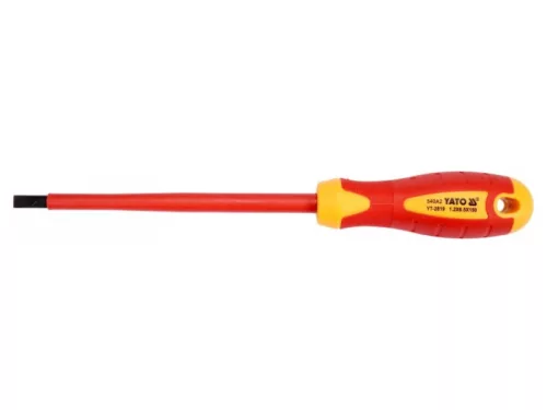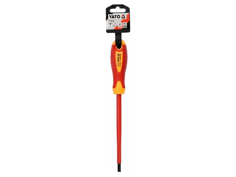 Laposfejű csavarhúzó YT-2819 VDE szigeteléssel, tartós S2 acélból készült, amelynek keménysége HRC 56-60.