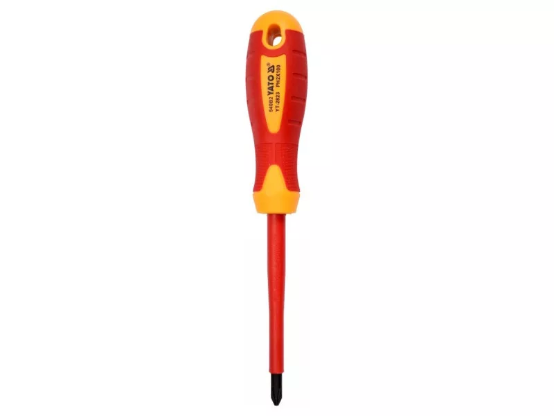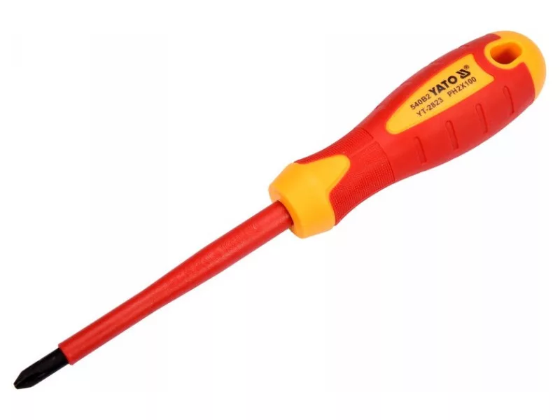 Kereszthornyú csavarhúzó YT-2823 VDE szigeteléssel, strapabíró S2 acélból készült, HRC 56-60 keménységgel. Phillips típusú csavarhúzó pengéje PH2 méretű penge hossza: 100 mm VDE tanúsítvánnyal rendelkező többkomponensű fogantyú, ami szigetelést biztosít akár 1000 V AC feszültségig. csúszásgátló tulajdonságok, köszönhetően a speciális mini barázdáknak az ujjhegyek helyén és a fogantyún található hornyoknak A YT-2823 szigetelt Phillips csavarhúzót egy német VDE akkreditált vizsgáló intézet laboratóriumában tesztelték és megfelel az EN 60900 követelményeinek.