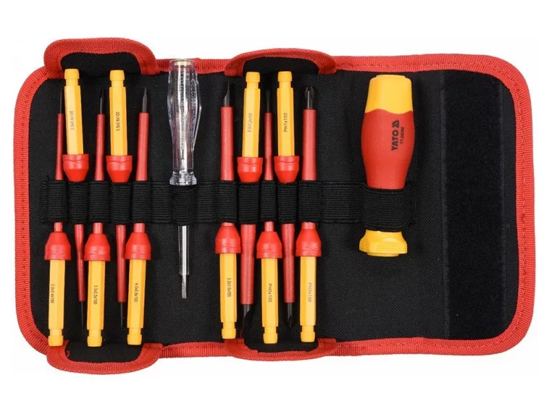 Csavarhúzó + bitek szett 12 részes YT-28290 VDE szigetelt nyéllel, tartós S2 acél pengével HRC keménységű 56-60.