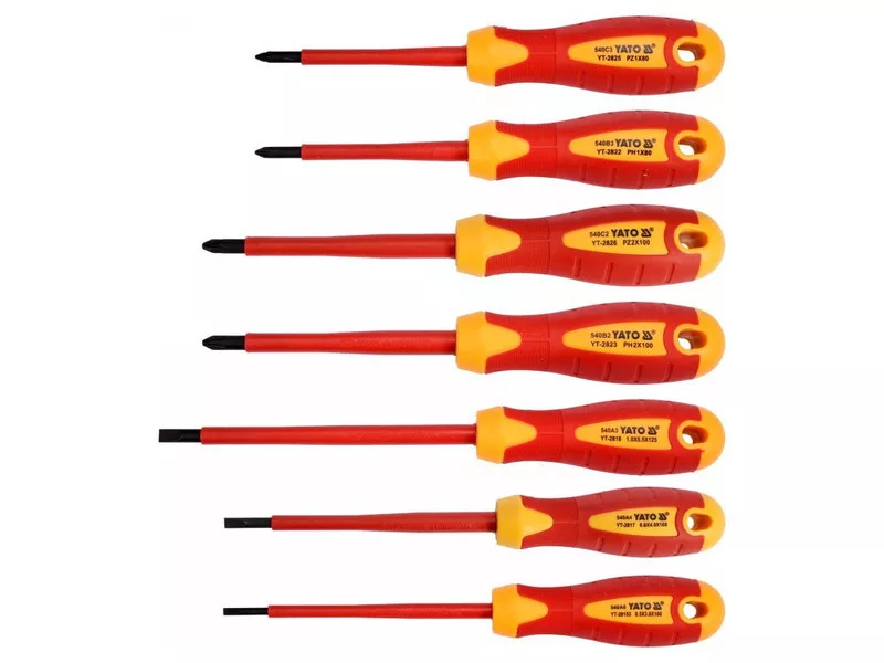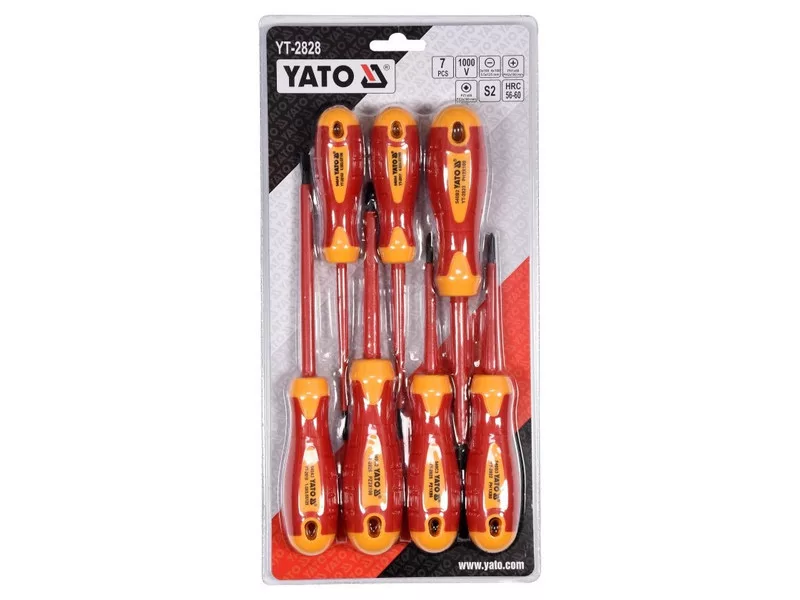 YT-2828 7 darabos csavarhúzó készlet VDE szigeteléssel, tartós S2 acélból készült, HRC 56-60 keménységgel.