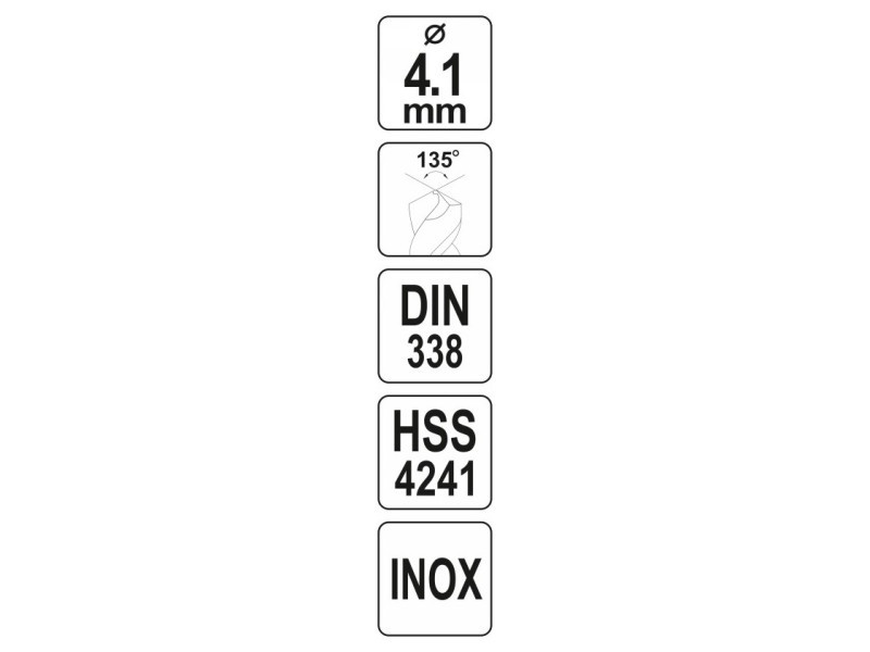 A prémium sorozatú fúrófejek kiváló minőségű HSS 4241 anyagból készültek. Professzionális, ipari alkalmazásokra terveztük - rozsdamentes acél, nagy szénacél és öntöttvas fúrásához. széles átmérőtartomány - 0,5-től 20 mm-ig további vágóél a fúrófej spirálján a DIN 338 szabvány szerint csiszolt felület kiváló pontosságot és gyorsabb fúrási sebességet biztosít a fúrt lyuk tökéletes méreteihez alacsonyabb súrlódási együttható csökkenti a forgácsok és a reszelék tapadását a fúrófejekhez "split point" keresztvágó él 135°-os hegyesszögűvel lehetővé teszi a fúrást előzetes jelölés nélkül, még nagy fúróátmérőknél is több mint 10 mm átmérőjű hengerelt fúrótokmányok a megfelelő illeszkedés érdekében a fúrótokmányban Paraméterek: átmérő [mm]: 4.1 hossz [mm]: 75 darabszám a készletben: 1 Használati figyelmeztetések: Figyelem! Mindig használjon személyes védőfelszerelést munka közben.