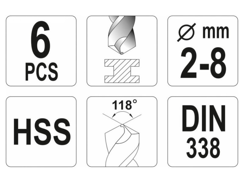 YATO fémfúró készlet. Magas minőségű gyorsacélból készült, HSS jelöléssel, hengeres nyéllel végződik. A fúrók erősített vágóéllel és 118 °-os csúcsszöggel rendelkeznek. Ipari és kézműves használatra tervezve, pontos fúráshoz acélban, vasban, fémekben, műanyagokban. A készlet tartalmaz 6 fúrót a következő átmérőkkel [mm]: 2, 3, 4, 5, 6, 8