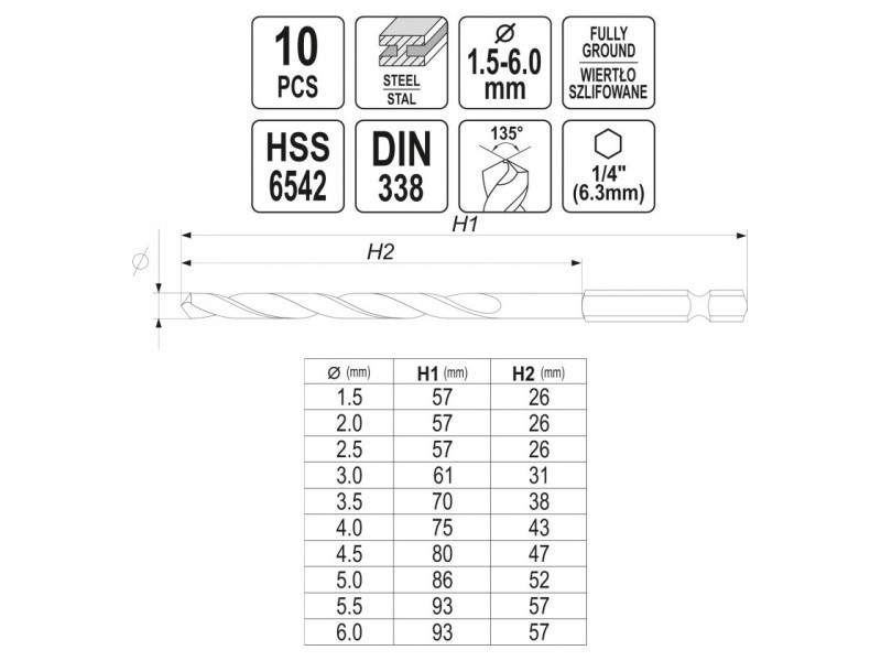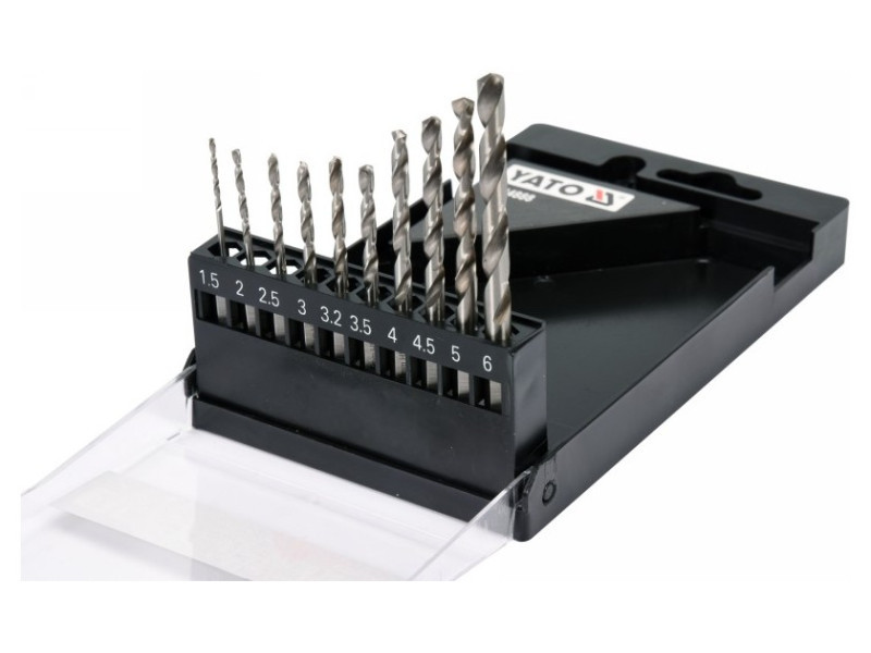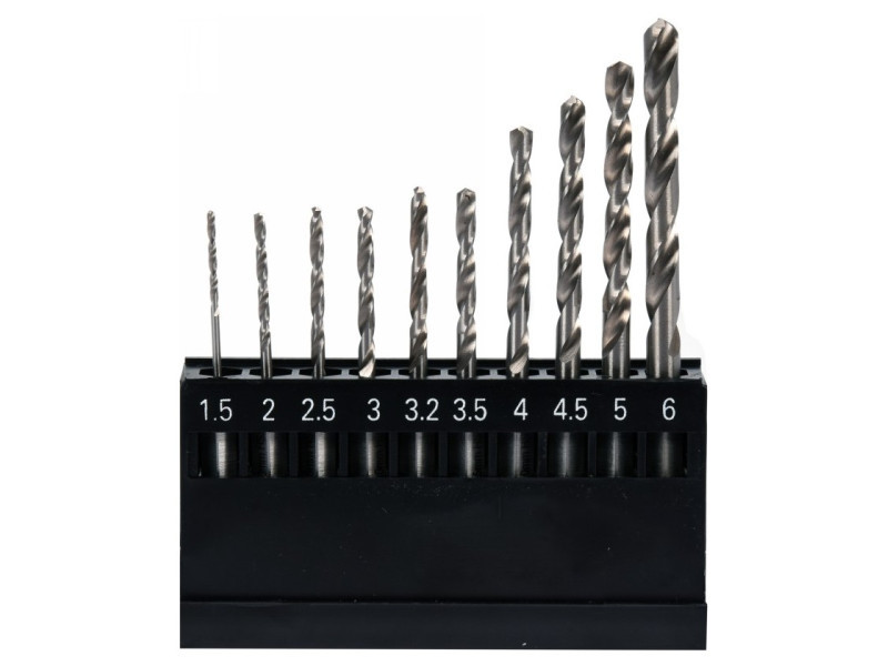 A készlet 10 HSS fúrófejet tartalmaz a következő átmérőkkel: 1.5, 2.0, 2.5, 3.0, 3.2, 3.5, 4.0, 4.5, 5.0, 6.0 mm, praktikus tokban csomagolva