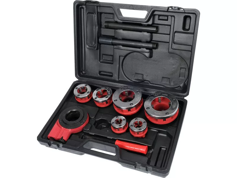 Magas minőségű csőmenetvágó készlet. A racsnis menetvágó rendszer és a munkairány váltókapcsoló sokkal könnyebbé teszi a menetvágást. A fejek nagyon tartós és erős 9Cr2 anyagból készültek.